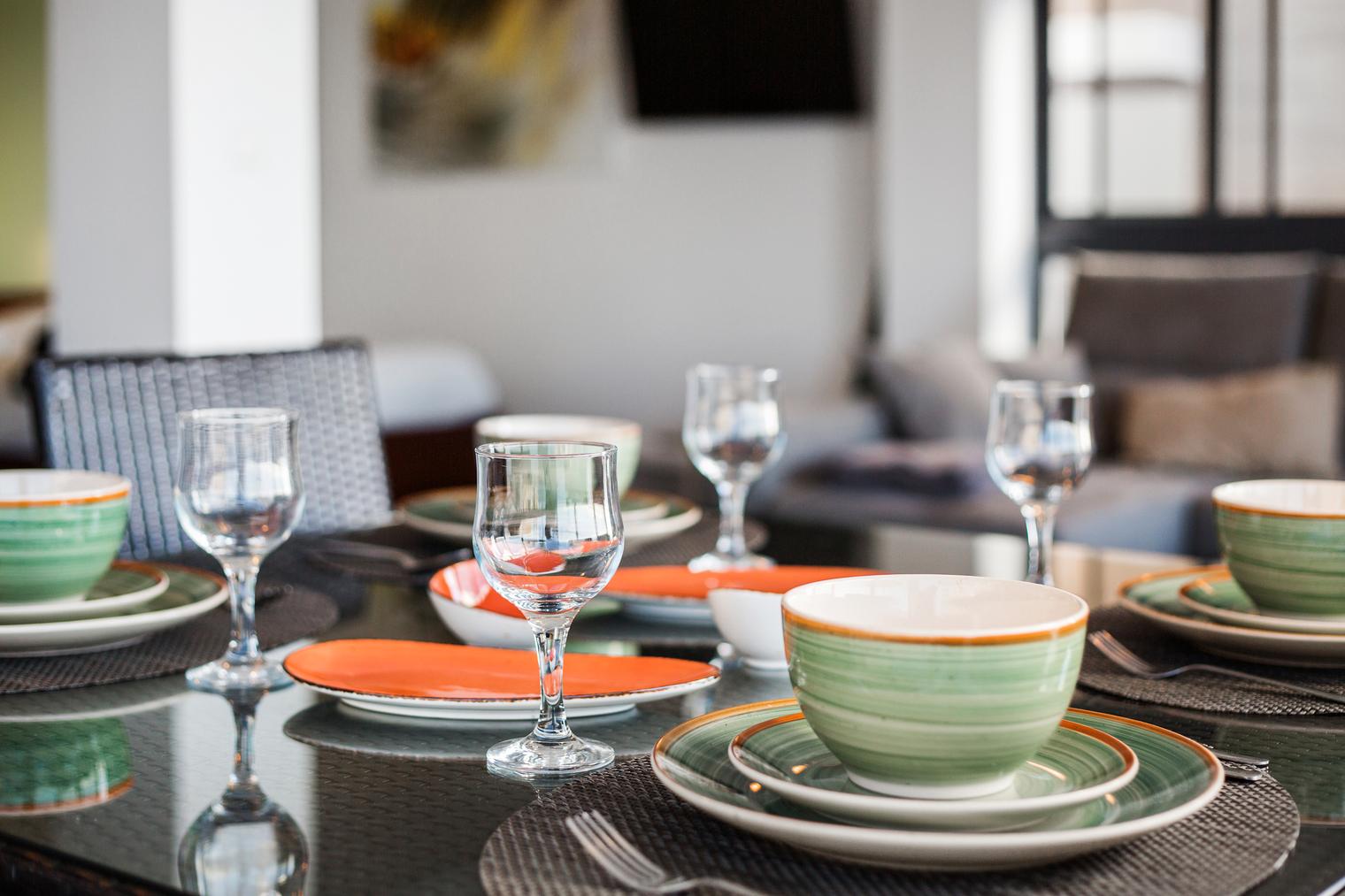 Utensils, pots and pans, oven, stove, microwave, coffee machine, toaster, olive oil, salt, pepper and fire extinguisher - Room