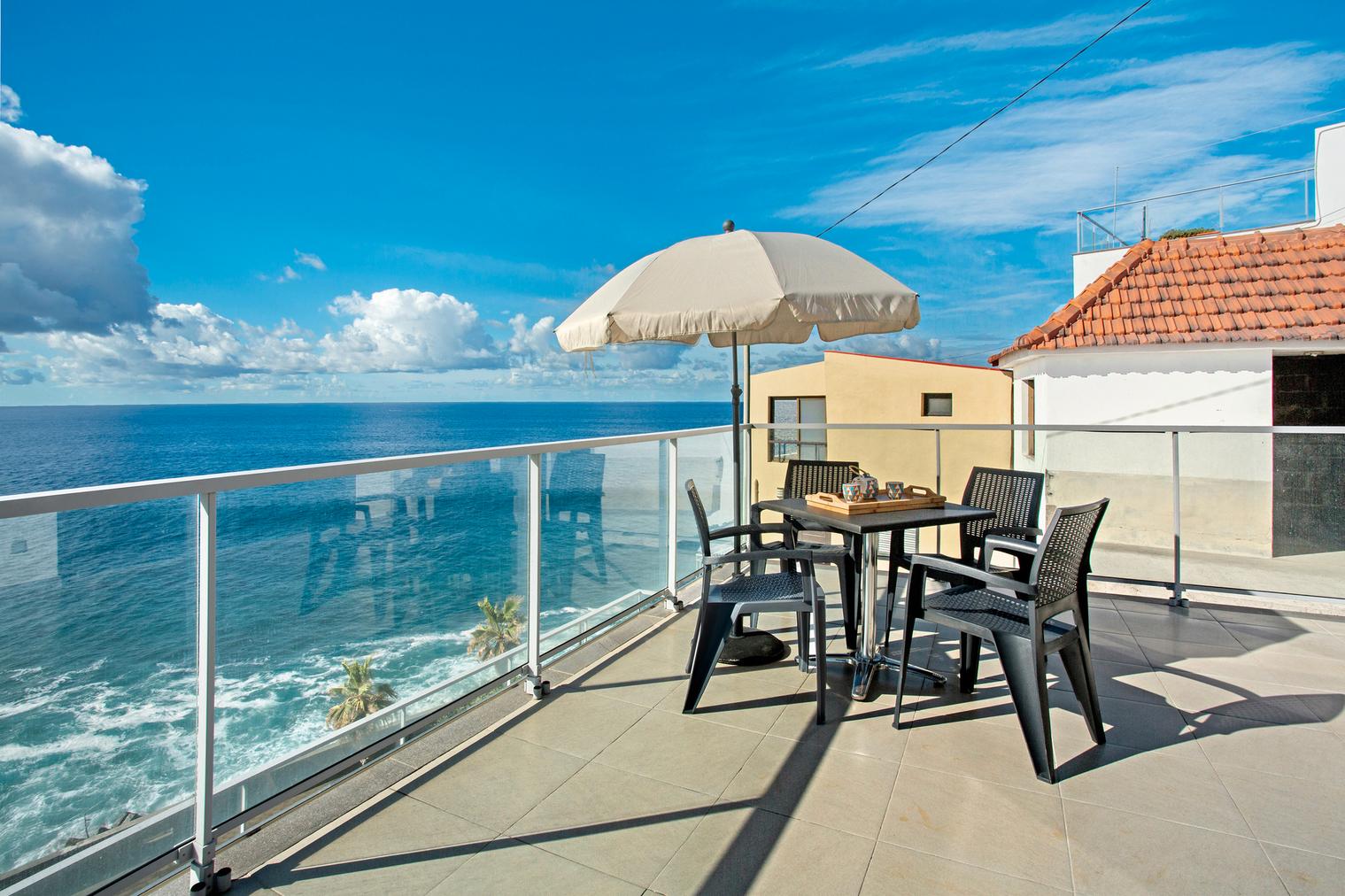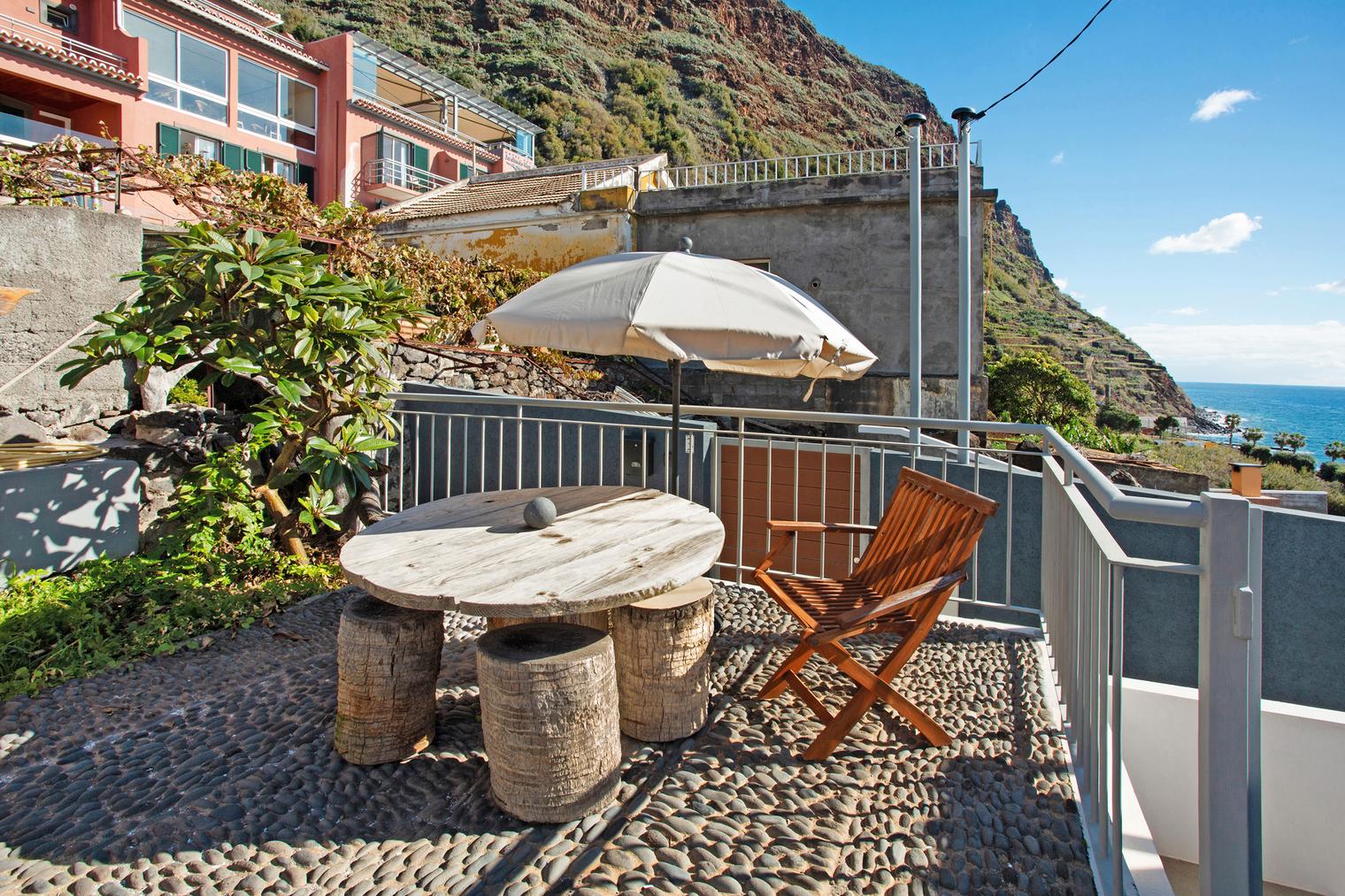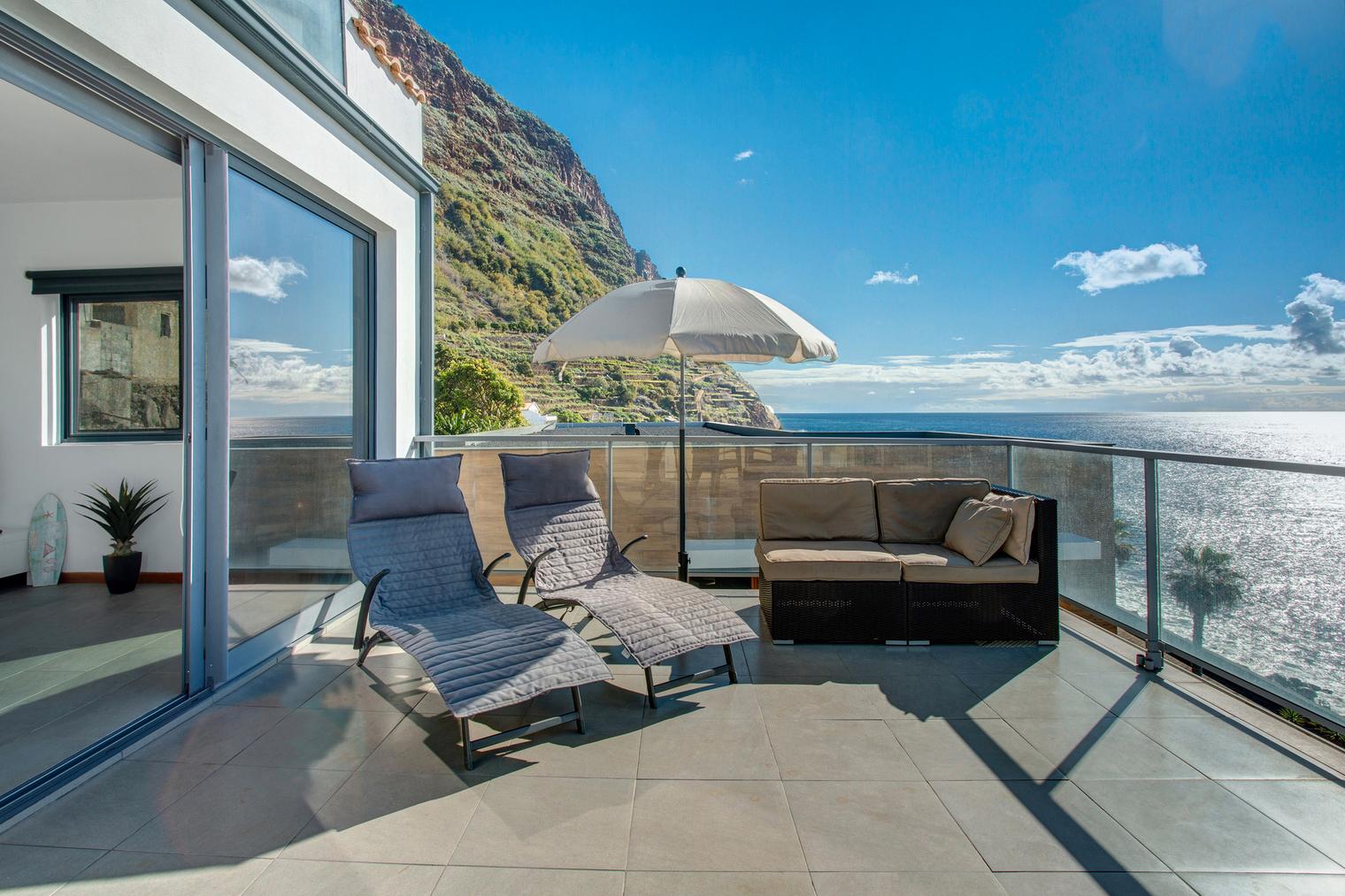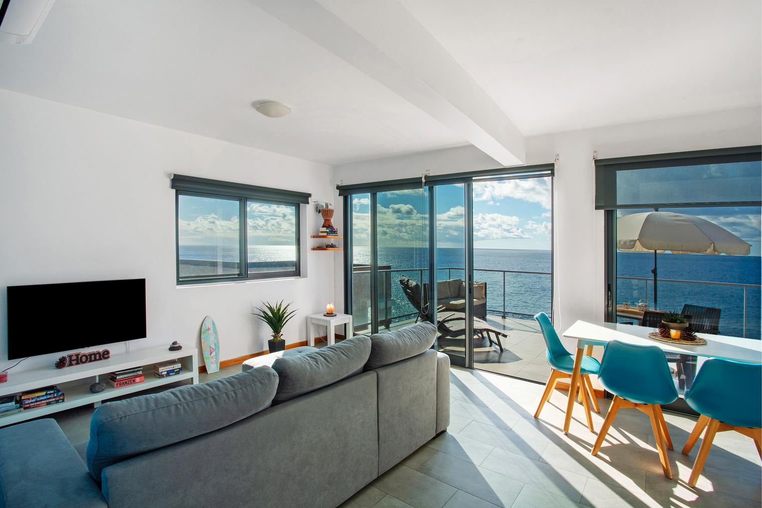 This is the best family Wave House apartment contemporary minimalist style (solar powered) - we call it Unit 3 and it is a 2 bedroom oceanfront - T2 - with large master bedroom and smaller kid room, a fully equipped kitchen with granite countertops and large fridge, bathroom with shower, free cable TV and WIFI internet, backyard with organic garden and sitting area, spacious veranda (4 meters by 6.5 meters), amazing view of ocean from every room, laundry room near backyard - it is in the best location in the best village in Madeira!