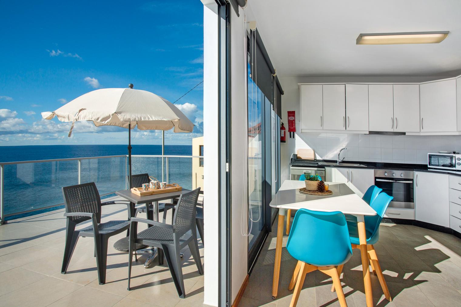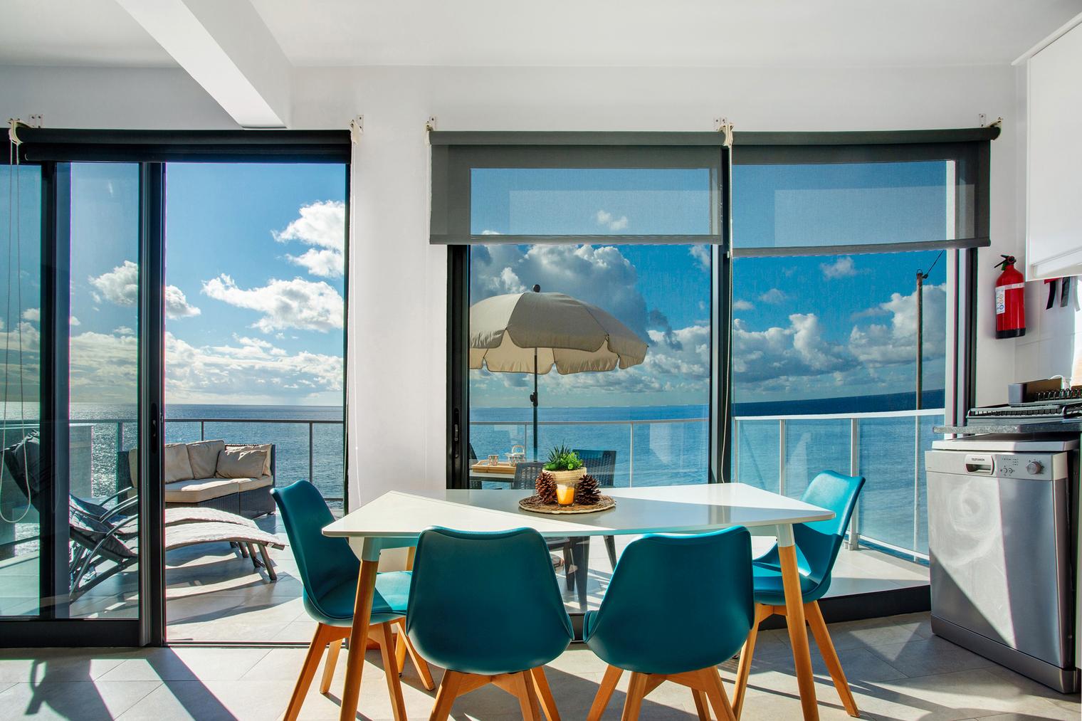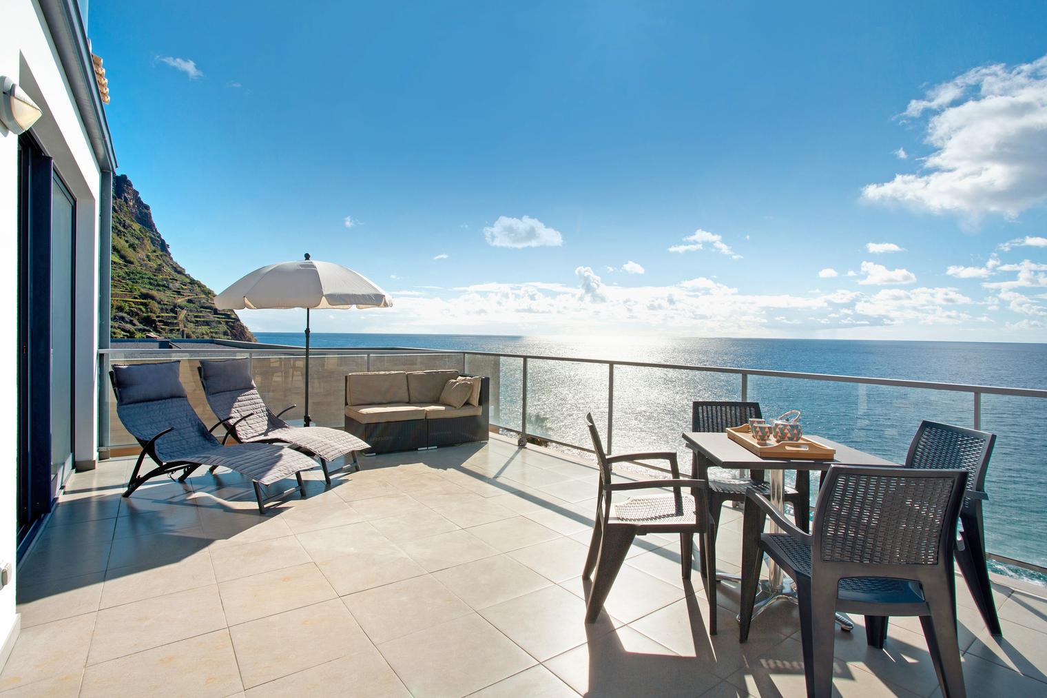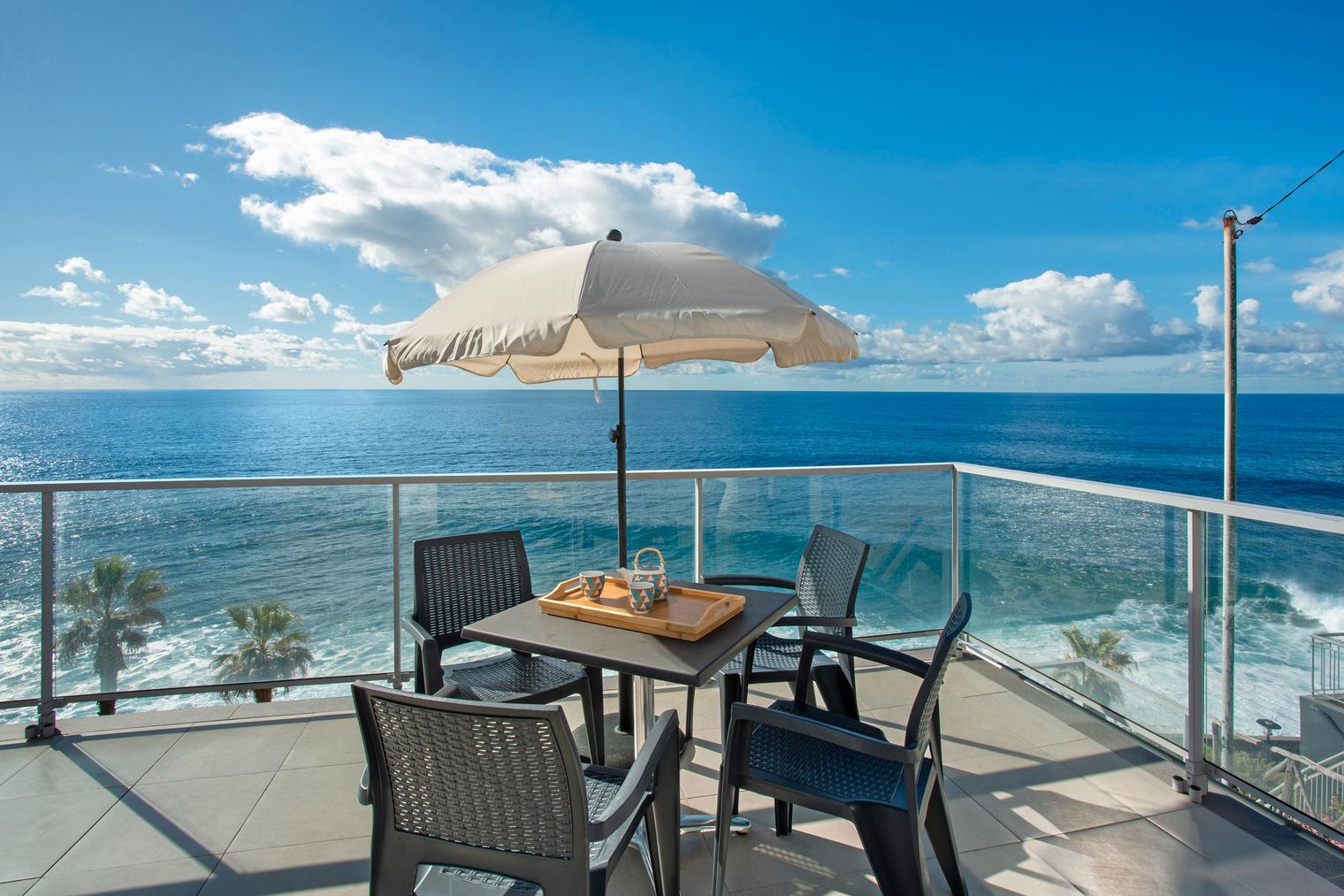 This is the best family Wave House apartment contemporary minimalist style (solar powered) - we call it Unit 3 and it is a 2 bedroom oceanfront - T2 - with large master bedroom and smaller kid room, a fully equipped kitchen with granite countertops and large fridge, bathroom with shower, free cable TV and WIFI internet, backyard with organic garden and sitting area, spacious veranda (4 meters by 6.5 meters), amazing view of ocean from every room, laundry room near backyard - it is in the best location in the best village in Madeira!